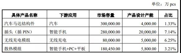 本次募投項(xiàng)目產(chǎn)品下游應(yīng)用包括消費(fèi)類電子行業(yè)和汽車領(lǐng)域,與公司現(xiàn)有的客戶群體相同。領(lǐng)益智造消費(fèi)類電子行業(yè)的客戶包括蘋果、華為、OPPO、vivo、小米等;汽車領(lǐng)域客戶群體包括德昌電機(jī)、萬(wàn)寶至馬達(dá)、愛龍威電機(jī)、MAGNA、DENSO和Brose等。本次募投項(xiàng)目產(chǎn)品設(shè)計(jì)產(chǎn)能占預(yù)估的市場(chǎng)容量情況如下: