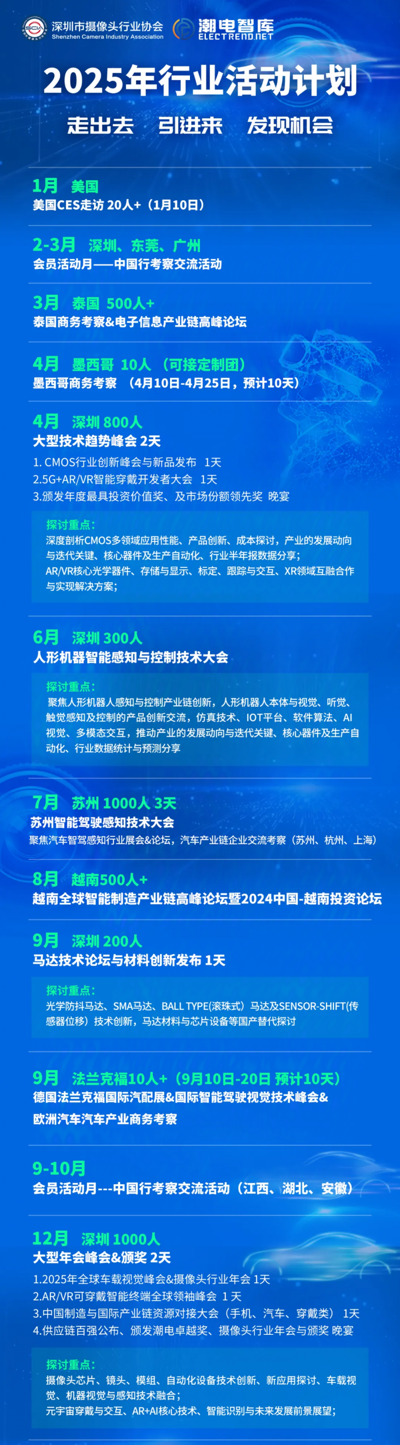 根據(jù)深圳市攝像頭行業(yè)協(xié)會發(fā)展規(guī)劃,明年會進一步發(fā)揮為政府、企業(yè)和行業(yè)服務的社會職能,吸收超過100家產(chǎn)業(yè)鏈新會員入會,而且將主辦CMOS圖像傳感器、人形機器人、VCM馬達、智能汽車視覺、具身智能、光學鏡頭等多場細分領域的專場峰會。