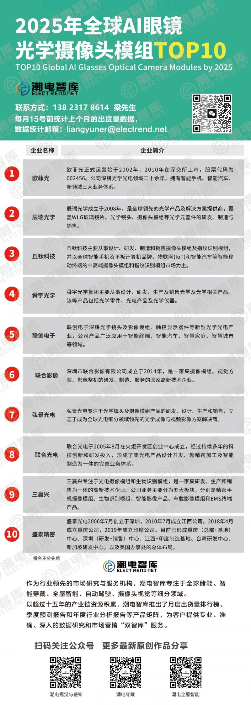 從技術(shù)層面來(lái)看,AI眼鏡的核心功能大致包括實(shí)時(shí)翻譯、增強(qiáng)現(xiàn)實(shí)導(dǎo)航、社交互動(dòng)以及個(gè)人助理等,但是需要滿足以上功能的前提是眼鏡能“看得到”,所謂看得到,無(wú)非就是在AI眼鏡上的光學(xué)影像,為更好的了解光學(xué)市場(chǎng)信息,潮電智庫(kù)整理了2025年全球AI眼鏡光學(xué)攝像頭模組廠商TOP10,歡迎未上榜企業(yè)聯(lián)系潮電智庫(kù)溝通。