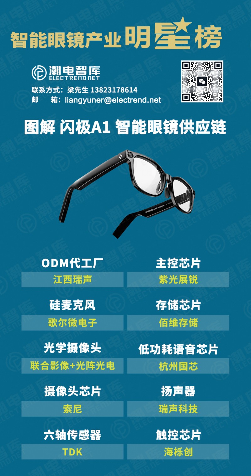 潮電智庫(kù)通過(guò)AI眼鏡產(chǎn)業(yè)鏈獲悉閃極A1眼鏡ODM代工廠來(lái)自江西瑞聲,搭載紫光展銳W517平臺(tái)和杭州國(guó)芯的低功耗語(yǔ)音芯片,硅麥克風(fēng)和揚(yáng)聲器分別來(lái)自歌爾微電子和瑞聲科技,存儲(chǔ)芯片/觸摸芯片/六軸傳感器供應(yīng)商分別來(lái)自佰維存儲(chǔ),海櫟創(chuàng),TDK,光學(xué)攝像頭供應(yīng)商為光陣光電+聯(lián)合影像,CMOS則是采用的索尼半導(dǎo)體。