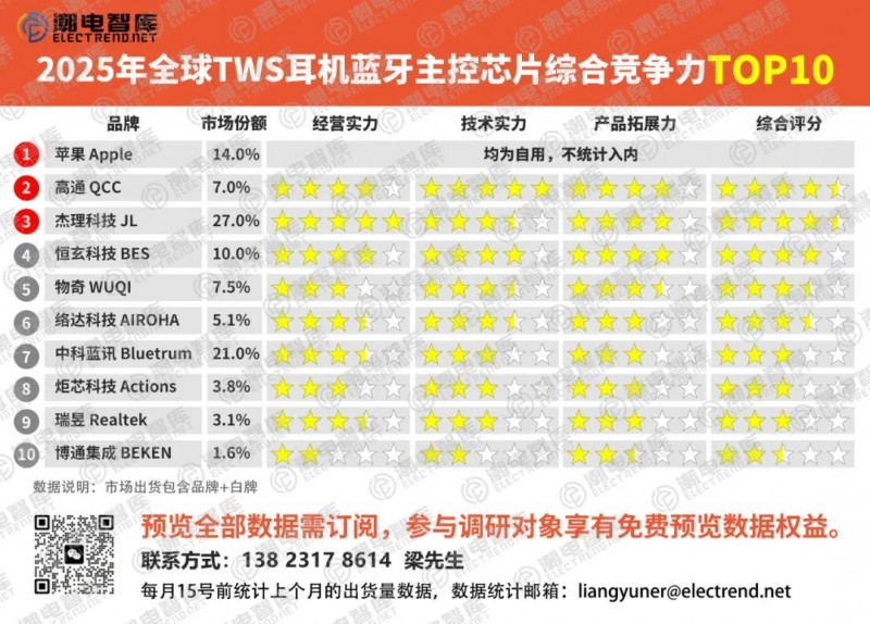 企業(yè)范圍:選取全球TWS主控芯片廠商作為排名對象。