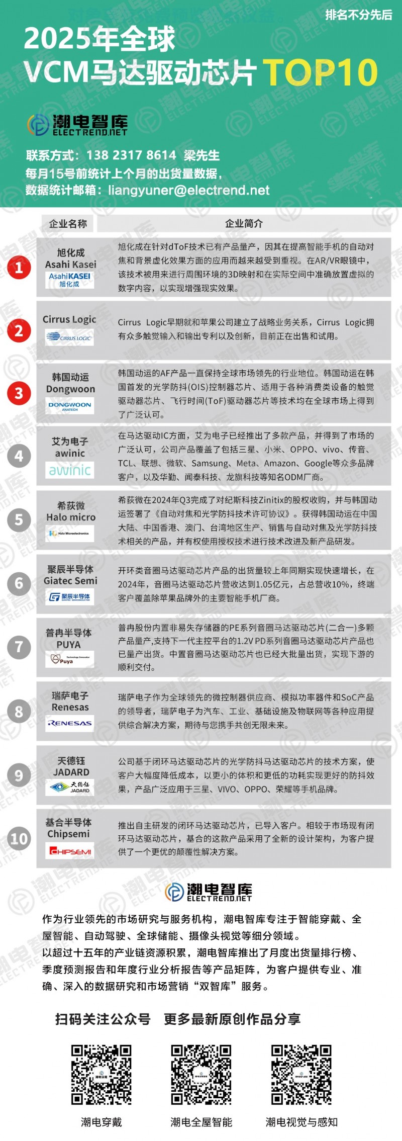 因VCM馬達(dá)驅(qū)動(dòng)芯片在各上市公司業(yè)務(wù)端份額較小,并且在網(wǎng)絡(luò)上公開(kāi)資料較少,為此我們通過(guò)整理出2025年更新版本的VCM馬達(dá)驅(qū)動(dòng)芯片TOP10,來(lái)反應(yīng)出市場(chǎng)變化。
