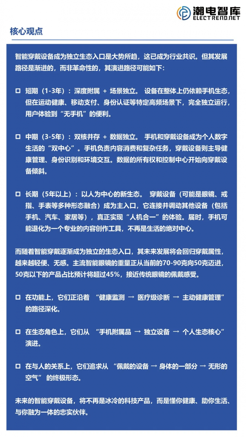 智能穿戴設(shè)備成為獨立生態(tài)入口是大勢所趨,這已成為行業(yè)共識。但其發(fā)展路徑是漸進的,而非革命性的,其演進路徑可分為短期(1-3年)、中期(3-5年)、長期(5年以上)。而隨著智能穿戴逐漸成為獨立的生態(tài)入口,其未來發(fā)展將會回歸穿戴屬性,越來越輕便、無感。未來的智能穿戴設(shè)備,將不再是冰冷的科技產(chǎn)品,而是懂你健康、助你生活、與你融為一體的忠實伙伴。