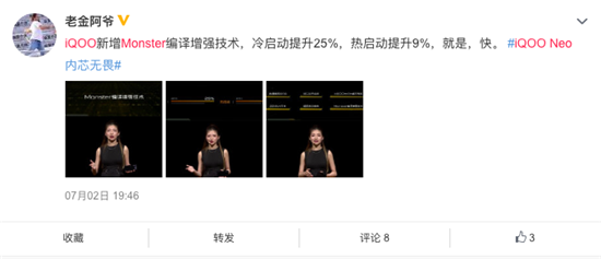 軟件部分,iQOO Neo采用了Monster編譯增強技術。這項技術可以對系統(tǒng)底層基礎進行全面優(yōu)化,在應用運行時,提前進行預編譯,大幅改善底層編譯效率,提升手機性能和APP響應速度,為iQOO Neo的驍龍845強勁心臟再提速。對于這項技術的加入,網(wǎng)友們表示:“iQOO新增Monster編譯增強技術,冷啟動提升25%,熱啟動提升9%,就是,快。”