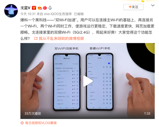今天,vivo產(chǎn)品經(jīng)理“戈藍V”的個(gè)人微博爆料,vivo已經(jīng)實(shí)現最新黑科技“雙Wi-Fi加速加速技術(shù)”:用戶(hù)可以在連接主Wi-Fi的基礎上,再連接另一個(gè)Wi-Fi,兩個(gè)Wi-Fi同時(shí)工作,使游戲運行更穩定,下載速度更快,網(wǎng)頁(yè)加載更順暢。戈連接家里的雙頻Wi-Fi(5G/2.4G),用起來(lái)好爽!大家覺(jué)得這個(gè)功能怎么樣?