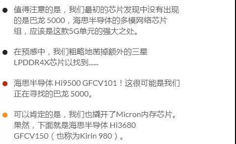 當(dāng)他們用刀揭開三星LPDDR4X芯片后,就發(fā)現(xiàn)了海思Hi9500 GFCV101芯片,而這就是巴龍5000 5G基帶芯片了。這也是首次在實(shí)際手機(jī)中看到的5G基帶芯片,而且這也是目前發(fā)現(xiàn)的首款擁有內(nèi)存的基帶芯片。