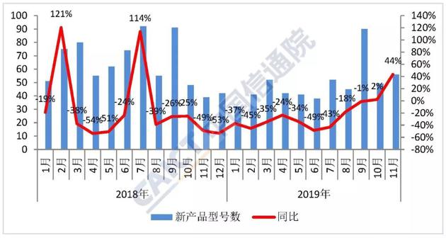 2019年11月,上市新機(jī)型56款,同比增長(zhǎng)43.6%,其中2G手機(jī)21款、4G手機(jī)31款、5G手機(jī)4款。