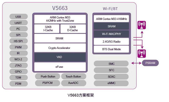 V5663是國(guó)內(nèi)首款支持Wi-Fi 5+BT 5+MCU的高集成AIoT解決方案,專為廣泛的物聯(lián)網(wǎng)應(yīng)用而打造,集成最新的IEEE 802.11ac 2x2 Wi-Fi 5,支持2.4GHz和5GHz雙頻,支持BT 5雙模藍(lán)牙及Wi-Fi&BT Mesh。