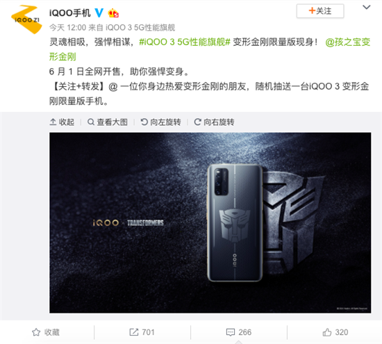 探索之心、敢越星辰,iQOO 3變形金剛限量版將于6月1日全網(wǎng)開售,作為iQOO粉絲的各位酷客們,可以準(zhǔn)備出手搶購了。