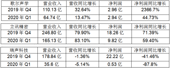 根據(jù)瑞聲科技2020年第一季度財報,營業(yè)收入178.84億元,同比下降1.36%,凈利潤22.22億元,同比下降87.8%。瑞聲科技是全球微型聲學(xué)行業(yè)的引領(lǐng)者之一,是三星、蘋果、華為等知名手機(jī)品牌的老牌供貨商,在TWS耳機(jī)領(lǐng)域具有無可比擬的競爭優(yōu)勢。