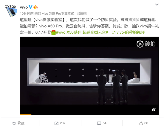 6月10日,vivo官微發(fā)布一則來自vivo影像實(shí)驗(yàn)室的防抖對比視頻,通過三個級別的抖動場景,全方位展現(xiàn)了vivo X50 Pro微云臺技術(shù)的防抖實(shí)力,吸引了網(wǎng)友的廣泛關(guān)注。