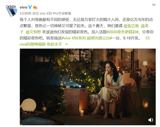 6月15日,vivo官微就公布了一則視頻,邀請(qǐng)張亞?wèn)|、麥子、文牧野等三位知名藝術(shù)家分享身邊的精彩夜色故事,并用vivo X50系列定格夜色的美好,引發(fā)了網(wǎng)友的廣泛熱議。