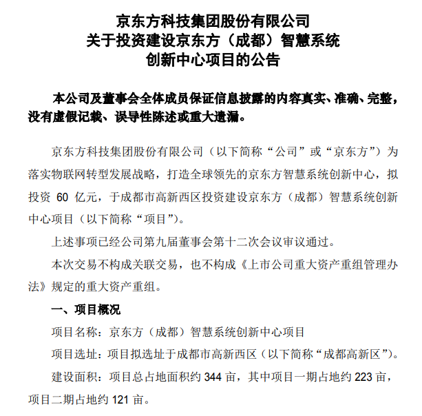 6月28日下午,京東方公告披露多項投資計劃,總投資額達132億元,包括兩個智慧系統(tǒng)創(chuàng)新中心和一家醫(yī)院。