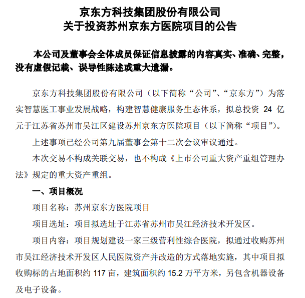除此之外,京東方還發(fā)布公告稱,為落實智慧醫(yī)工事業(yè)群發(fā)展戰(zhàn)略,構建智慧健康服務生態(tài)體系,擬總投資24億元于江蘇省蘇州市吳江區(qū)建設蘇州京東方醫(yī)院項目。項目規(guī)劃建設一家三級營利性綜合醫(yī)院,擬通過收購蘇州市吳江經濟開發(fā)區(qū)人民醫(yī)院資產并改造的方案落地實施。項目計劃于2020年完成資產摘牌并啟動改造,2021年投入運營。