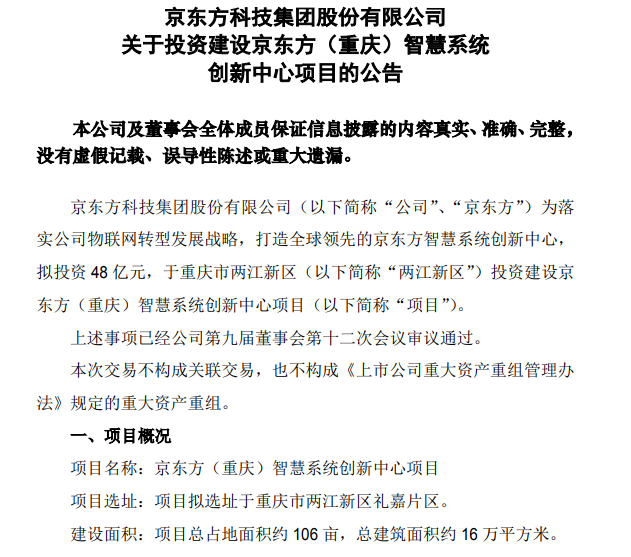 京東方公告稱,為落實物聯(lián)網轉型戰(zhàn)略,擬投資48億元在重慶兩江新區(qū)投資建設京東方(重慶)智慧系統(tǒng)創(chuàng)新中心項目(以下簡稱“重慶項目”),擬投資60億元在成都高新西區(qū)投資建設京東方(成都)智慧系統(tǒng)創(chuàng)新中心項目(以下簡稱“成都項目”)。