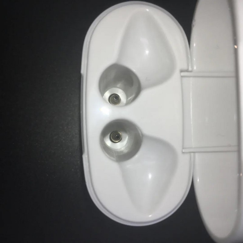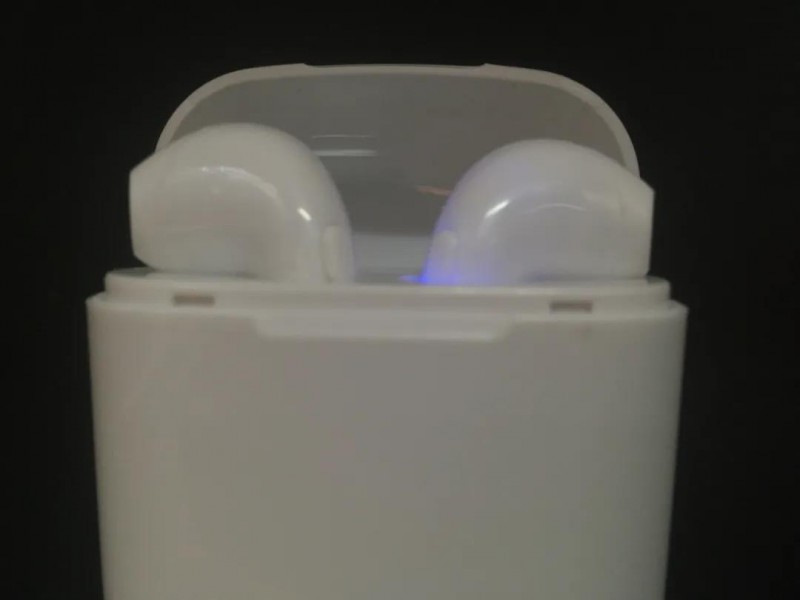 兩個耳機比Air pods大了一圈,尤其是耳機柄設置的小小呼吸燈,非常復古。夸張的是耳機內(nèi)的呼吸燈可以透過外殼閃爍,甚至于透過充電倉也能看到閃爍的“跑馬燈”。充電倉內(nèi)部采用了類似Air pods的設計,更驚奇的發(fā)現(xiàn)在充電槽內(nèi)。不像多數(shù)TWS耳機內(nèi)有磁吸觸極或頂針充電,i7S內(nèi)充電槽竟然是類似3.5mm三段式的OMTP,看似有1cm長的接口,耳機充電時接入接口。十分簡陋。