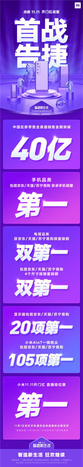 主打“智造新生活”,發(fā)放10億補貼,今年小米雙十一不僅在手機和電視兩大品類(lèi)保持傲人成績(jì),小米AIoT一騎絕塵!斬獲京東、天貓、蘇寧易購三平臺105項第一。