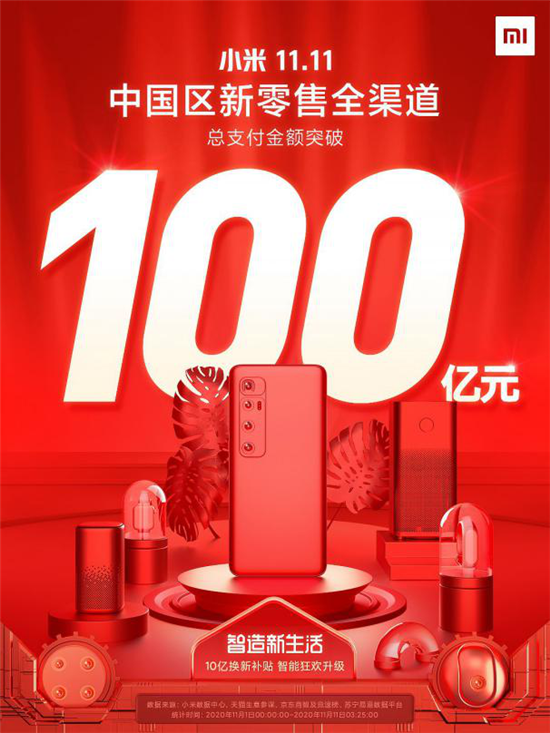 截止11月11日10:00,根據小米數據中心官方統計,小米中國區新零售全渠道總支付金額突破100億元,全面超越2019年小米雙十一銷(xiāo)售記錄。