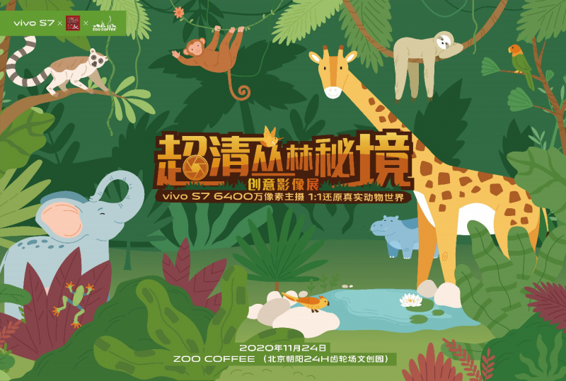 2020年11月24日,vivo S7聯(lián)合攝影之友于北京ZOO COFFEE舉行了主題為“vivo S7超清叢林秘境”的創(chuàng)意影像展,展覽還原了野生動物的生存環(huán)境,由vivo S7后置鏡頭拍攝并1:1比例還原的近20種野生動物隱藏其中,等待大家前來探險。