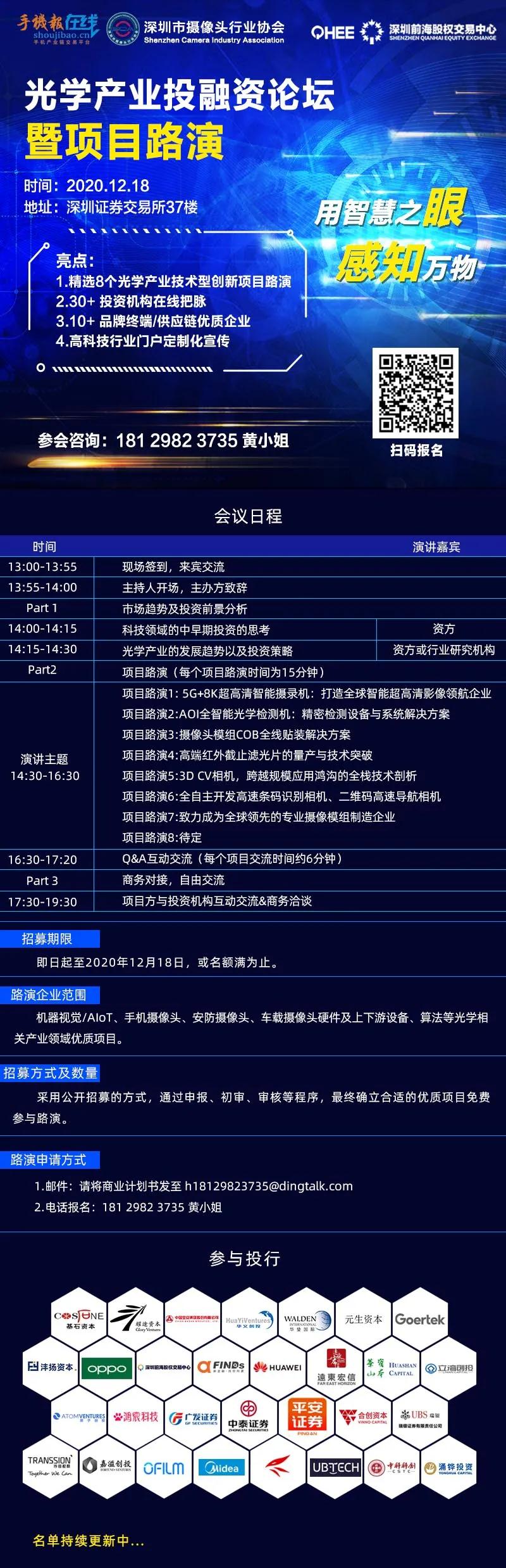 在光學(xué)席卷各行各業(yè)的今天,智能家居、物聯(lián)網(wǎng)、智慧城市、環(huán)境監(jiān)測、安防、車載、手機、筆記本電腦、掃地機器人等多個智能領(lǐng)域都可發(fā)現(xiàn)攝像頭的身影,不過,伴隨著市場變化、機遇的同時,為了有效解決部分廠商遇到的投融資及信息不對稱等問題,手機報在線聯(lián)合攝像頭行業(yè)協(xié)會特在深圳舉行“光學(xué)產(chǎn)業(yè)投融資暨項目路演”。