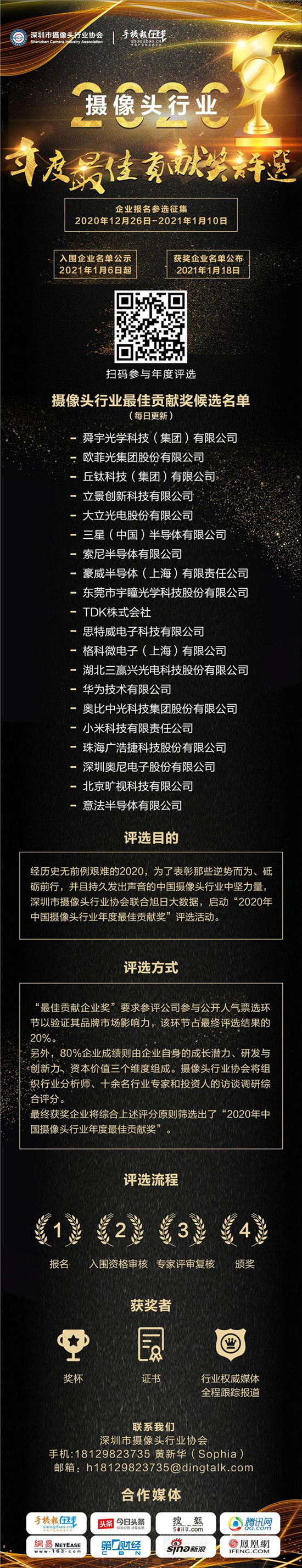 經(jīng)歷史無前例艱難的2020,為了表彰那些逆勢而為、砥礪前行,并且持久發(fā)出聲音的中國攝像頭行業(yè)中堅力量,深圳市攝像頭行業(yè)協(xié)會聯(lián)合旭日大數(shù)據(jù),啟動“2020年中國攝像頭行業(yè)年度最佳貢獻獎”評選活動。
