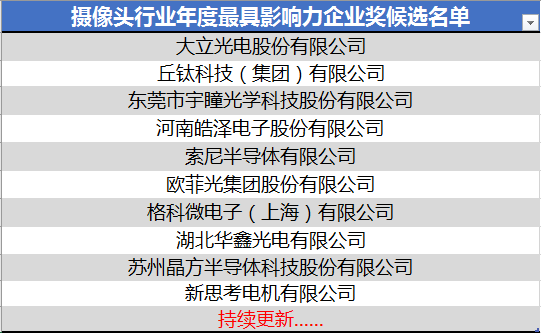 2月23日,2020年攝像頭行業(yè)最具影響力企業(yè)獎候選名單正式公布。如下圖所示: