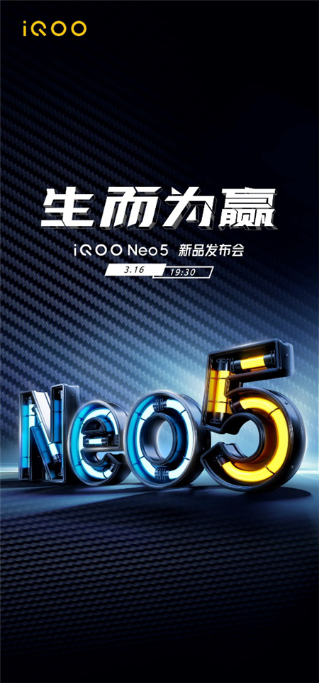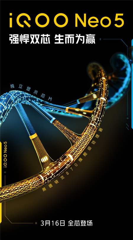 2021年3月4日, iQOO手機(jī)官方微博公布iQOO Neo5新品將于3月16日19:30正式亮相。iQOO Neo5定位“雙芯旗艦”,擁有驍龍870領(lǐng)銜的“性能超體”,將給予用戶旗艦級(jí)強(qiáng)悍性能體驗(yàn);獨(dú)立顯示芯片是新機(jī)的另一大亮點(diǎn),它將為手機(jī)帶來優(yōu)秀的游戲視覺,以及穩(wěn)定、流暢且功耗更低的高幀游戲體驗(yàn)。