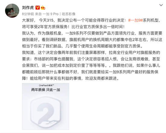 2021年3月15日,一加手機(jī)宣布,即將發(fā)布的一加9系列產(chǎn)品享受2年官方質(zhì)保服務(wù)。一加手機(jī)打破行業(yè)質(zhì)保慣例,將質(zhì)保時(shí)間從行業(yè)通用的1年提至2年,為購(gòu)買(mǎi)一加9系列手機(jī)的用戶(hù)提供最好的服務(wù)保障。
