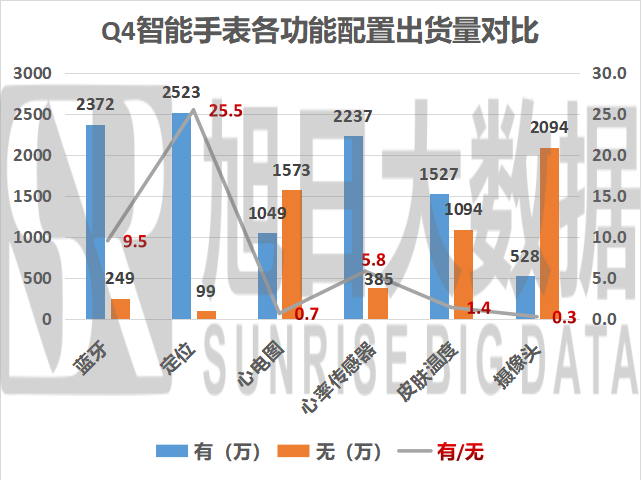 根據(jù)數(shù)據(jù)君的統(tǒng)計分析可以看出,消費者對藍牙、定位、心率監(jiān)測的需求極為突出,按照出貨量的功能有無比來看數(shù)量差距巨大。對有無溫度測量的需求數(shù)量相當,而對心電圖測量和擁有攝像頭的需求則相對消極。