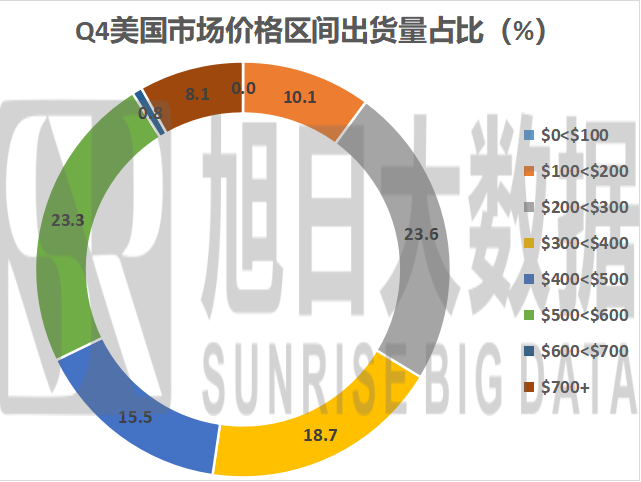 美國的消費能力最高,200-500美元的價格區(qū)間只占不到60%的空間,另有20%多的份額處于500-600美元的價格區(qū)間。