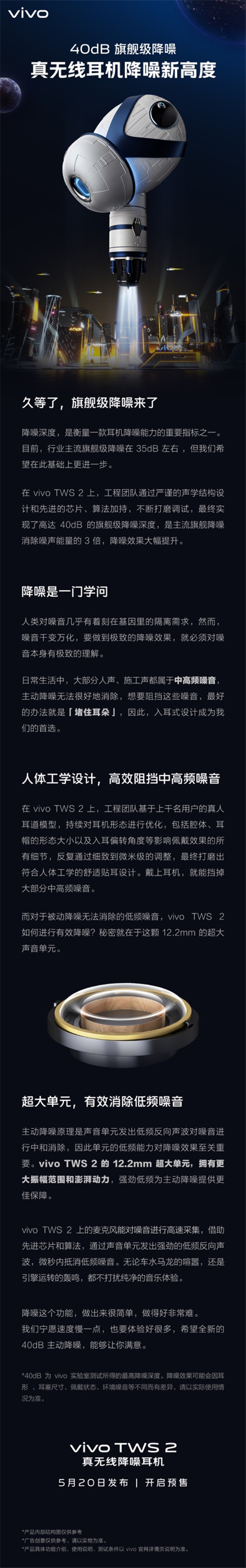 隨著5月20號(hào)發(fā)布會(huì)的即將到來(lái),關(guān)于vivo新品TWS 2真無(wú)線降噪耳機(jī)的消息不斷曝光,可以肯定的是,vivo TWS 2在音質(zhì)上繼續(xù)延續(xù)“好聲音”的理念,搭載的12.2mm超大單元、DeepX 2.0立體聲效、DEEP-HD超清音頻引擎等技術(shù)只為提升音質(zhì)表現(xiàn)服務(wù)。其實(shí),vivo TWS 2的賣點(diǎn)并不僅僅局限于聲音本身,作為vivo首款附帶主動(dòng)降噪功能的耳機(jī),vivo TWS 2的主動(dòng)降噪功能的表現(xiàn)也是可圈可點(diǎn)的。