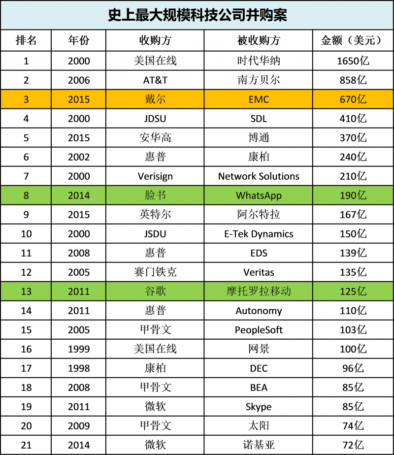 戴爾以670億美金并購(gòu)EMC,業(yè)內(nèi)普遍視為任性的豪賭行為。那么戴爾究竟有多任性,在人類(lèi)最近百年的科技發(fā)展史上,這筆交易金額有多龐大?下表呈現(xiàn)史上最大規(guī)??萍脊静①?gòu)案,便于大家直觀(guān)地做橫向比較。