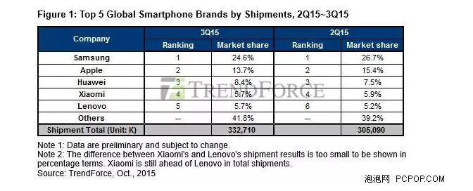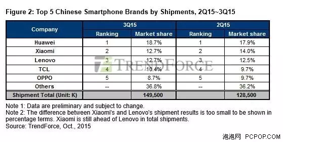 2015第二季度和第三季度全中國五大智能手機(jī)廠商排名