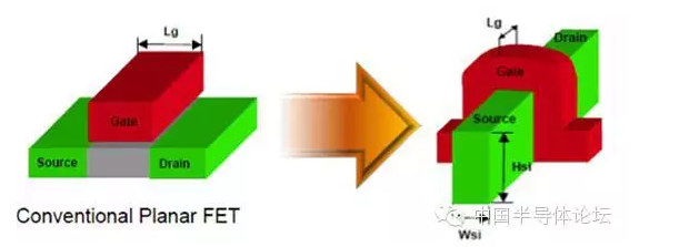 剛才講到Gate越窄,也就是納米數(shù)越低,功耗和性能的收益都很明顯。但是世界上所有事情都有兩面,有收益就會有代價。左圖中紅色Gate越窄,則Gate接觸下面的面積就越小,前面說了,綠色SD兩極的通斷是靠Gate通電壓控制的,但是面積越小這個Gate的控制力越弱,這就會導致出現(xiàn)兩極之間的漏電越來越大,這個問題在20nm達到了一個很大的值,對功耗影響很大。所以早在10年前,就有人提出了新結(jié)構(gòu)(右圖),3D晶體管,由于這個結(jié)構(gòu)看上去像張開的魚鰭,所以被叫做FinFET技術(shù)。FinFET技術(shù)最主要的好處是紅色的Gate變成三面環(huán)繞綠色SD兩極之間的通道了,這樣Gate就又重新具備了對這個通道的強力控制力,原先通過減小Gate寬度的方法就可以繼續(xù)了。所以,三星和臺積電也都是在其14/16nm的這一代工藝開始用上FinFET技術(shù)。有人可能會有疑問,十年前就提出為什么現(xiàn)在才用,其實概念到實施不是那么容易的,大家腦補一下這個結(jié)構(gòu)是在20nm的范圍里做的,導致工藝要多出十幾二十層來,這不僅是難度,也是成本,所以兩家都在這個相似的時間應用到新產(chǎn)品中也側(cè)面說明三星14nm和臺積電16nm是同代工藝。
