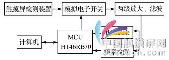觸摸屏控制電路整體結(jié)構(gòu)如圖3所示。當(dāng)用觸摸筆觸摸LCD顯示屏?xí)r,觸摸檢測裝置對應(yīng)的X、Y軸上會分別感應(yīng)到一個信號,這個信號經(jīng)過模擬電子開關(guān),然后經(jīng)兩級放大、濾波,將得到的信號分兩路處理,一路是電壓整流,另一路是頻率檢測電路;得到的數(shù)據(jù)通過MCU HT46RB70計算,判斷出觸摸屏的位置及觸摸的方式,再由MCU將觸摸信號發(fā)送到計算機,最終實現(xiàn)觸摸輸入。整個觸摸屏控制電路的時序都是由單片機控制的,其他模塊的電路見后面的詳細(xì)介紹。