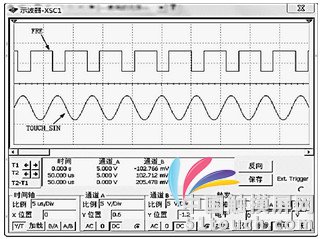 觸摸信號的頻率是由觸摸筆發(fā)出,觸摸筆上有兩個按鍵,按下這兩個按鍵可以輸出兩個不同頻率的信號,分別為k1、k2。觸摸筆的作用相當(dāng)于鼠標(biāo),當(dāng)觸摸筆輸出一次k1頻率時相當(dāng)于點擊一下鼠標(biāo)左鍵,輸出一次k2頻率相當(dāng)于點擊鼠標(biāo)右鍵。當(dāng)觸摸筆筆尖與LCD距離≤3~5 cm時,觸摸檢測裝置可感應(yīng)到觸摸信號,這時光標(biāo)隨著觸摸筆在LCD上移動。觸摸信號頻率檢測精度的高低是觸摸屏是否穩(wěn)定的關(guān)鍵因素。頻率檢測電路及仿真結(jié)果如圖5、圖6所示,TOUCH_SIN端為觸摸信號輸入端,通過施密特觸發(fā)器,然后信號從FRE端發(fā)送到單片機,進(jìn)行運算處理,計算出觸摸信號的頻率。利用Multisim軟件平臺建立出頻率檢測電路仿真模型,從仿真結(jié)果中可以看到,經(jīng)過處理后的觸摸信號轉(zhuǎn)換為具有相同周期T的方波信號,將方波信號傳送到微處理器,微處理器在t時間里計算出方波的個數(shù)n,則信號的周期T=t/n,頻率f=1/T,由此確定觸摸信號的頻率。