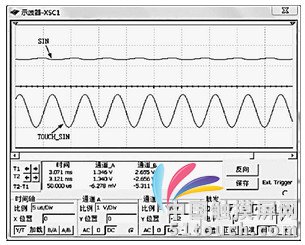 當(dāng)觸摸筆靠近LCD時,觸摸檢測器獲得感應(yīng)信號,經(jīng)過電子開關(guān)及信號處理電路后,再對信號進(jìn)行整流。觸摸信號整流電路如圖7所示。觸摸信號由TOUCH_SIN輸入,經(jīng)過二極管D整流。圖中CONTROL與HT460RB70的PC4引腳相連接, HT460RB70通過PC4引腳控制三極管的導(dǎo)通狀態(tài),通過電容充放電直接影響整流后的波形,使其更加準(zhǔn)確。信號整流后還需經(jīng)過一個同相放大電路,然后從SIN發(fā)送到HT460RB70單片機PCO/INT引腳。在Multisim中對觸摸電壓信號整流電路的仿真結(jié)果如圖8所示,圖中信號SIN是處理后的信號波形。其結(jié)果表明,通過整流后得到平滑穩(wěn)定的直流電壓信號,有利于提高A/D轉(zhuǎn)換的精度。