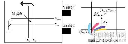 其中,Xn,Ym、 Xn+1,Ym+1是已知坐標(biāo),ΔVx、ΔVy為已知常數(shù),ΔVx是觸摸筆在Xn軸上時Vn與Vn+1的差值,ΔVy則是觸摸筆在Ym軸上時Vm與Vm+1的差值。