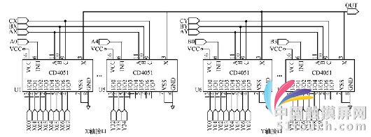 模擬電子開關(guān)電路如圖4所示,該電路的功能是驅(qū)動觸摸屏檢測裝置,將觸摸信號傳送到信號處理電路。其電路主要是由CD4051組成,CD4051是一個8通道數(shù)字控制模擬開關(guān),該芯片有3位二進(jìn)制控制輸入端A、B、C 和一個使能輸入端INH,以及8個信號輸入端和1個公共輸出端。當(dāng)INH輸入端為高電平時,所有通道截止;當(dāng)INH為低電平時,單片機通過3位二進(jìn)制信號A、B、C選通一個通道的輸入信號,從公共輸出端OUT輸出,經(jīng)過兩級放大電路及濾波電路后,將觸摸信號分別發(fā)送到頻率檢測電路和電壓整流電路的TOUCH_SIN端。圖4中AX、BX、CX是X軸方向上電子開關(guān)的控制輸入端,A0~A4是X軸方向上的電子開關(guān)的使能端,X00~X34與觸摸屏檢測裝置X軸接口相連接,由于一個CD4051芯片只有8個通道的數(shù)字模擬開關(guān),不能滿足線圈數(shù)量的需求,故這里設(shè)計了由5個CD4051(U1~U5)組成的X軸方向上的模擬電子開關(guān)電路。同理可設(shè)計Y軸方向上模擬電子電路。AY、BY、CY為控制輸入端,B0~B3作為使能端,Y軸由4個CD4051(U6~U9)組成,圖中Y00~Y29與觸摸屏檢測裝置Y軸接口相連接。