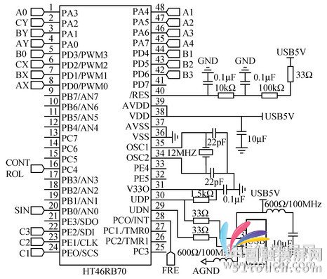 MCU電路采用Holtek公司的RISC單片機——HT47RB70。該單片機是A/D轉(zhuǎn)換型8位USB單片機,專門為USB產(chǎn)品而設(shè)計,尤其適用于USB或SPI接口觸控屏、觸控按鍵等產(chǎn)品。