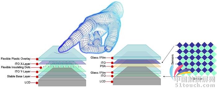 我們將深入了解一下兩個(gè)最常用的觸控屏技術(shù)。使用最廣泛的技術(shù)是電阻式觸控。絕大多數(shù)人可能以前都在銀行的ATM機(jī)上、許多商場(chǎng)里的信用卡檢查機(jī)、甚至是在餐館里輸入一個(gè)訂餐單時(shí)用過(guò)這類電阻式觸控技術(shù)。而投影型電容式觸控屏,使用的范圍還沒(méi)有這么廣,但具有快速發(fā)展動(dòng)力。許多采用投影型電容式界面的手機(jī)和便攜式音樂(lè)播放器都在投放市場(chǎng)。無(wú)論是電阻式或電容式技術(shù)都有一個(gè)堅(jiān)固的電組件,都利用ITO(氧化銦錫,透明導(dǎo)體),這兩種技術(shù)都會(huì)長(zhǎng)期使用。